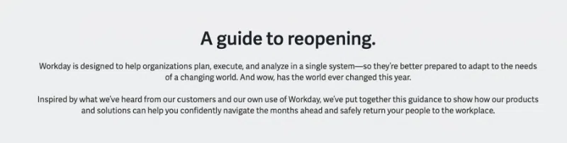 Take Workday for example. They created an entire guide to showcase how their products and solutions can help businesses navigate uncertain times and safely return people back to the workplace.