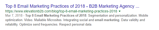 For instance, take a look at the SERP listing below. Notice how the headline describes and builds excitement for what marketers can expect: Solid advice for marketing to audiences via email! The meta description is then written to further entice prospects to click-through, as it mentions segmentation, personalization, mobile optimization, and more.