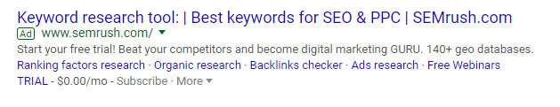When it comes to using keywords in your ads, focus on buyer intent and relevance. Case in point, examine the ad below. The search phrase “Keyword research 2018” produced the ad below, which promises to deliver on that query with the keyword placed first in the meta title.