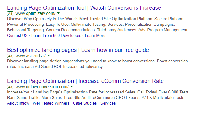 The search query “landing page optimization 2018” produced the ads below. Each front-loads the keyword phrase (the middle one uses “best-optimized landing page,” which may be a hot related keyword phrase) to deliver more click-throughs and conversions.